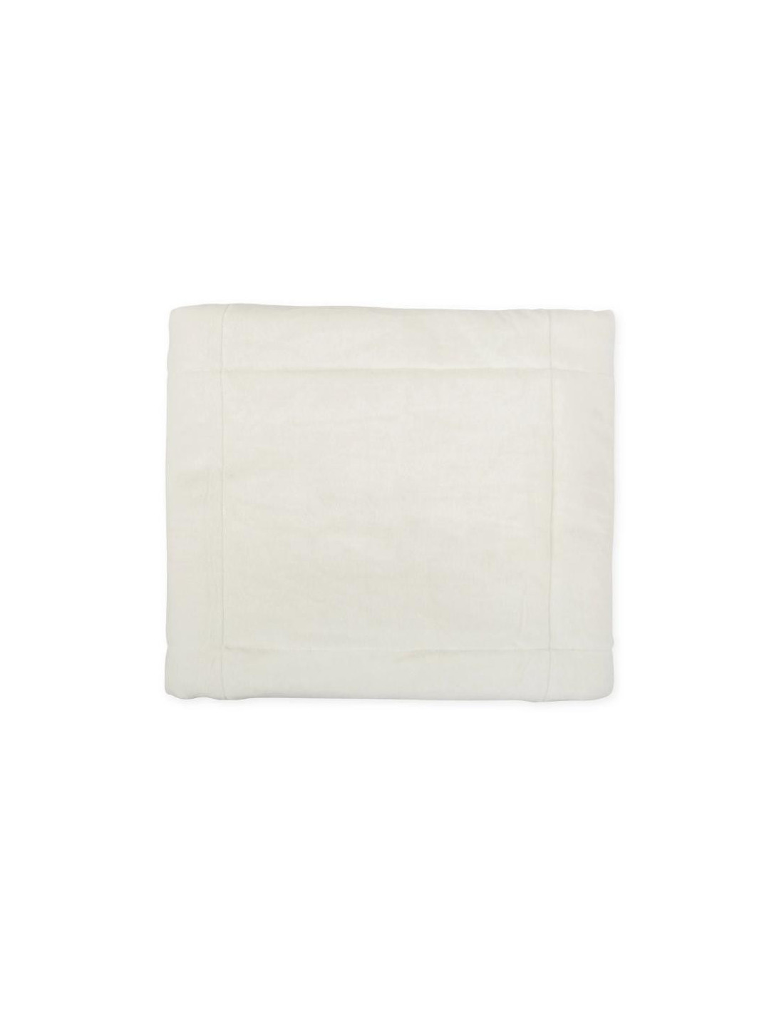 Manta en tundosado blanco roto con rayas en tonos arena y gris forrada con tundosado liso y suave relleno en el interior.