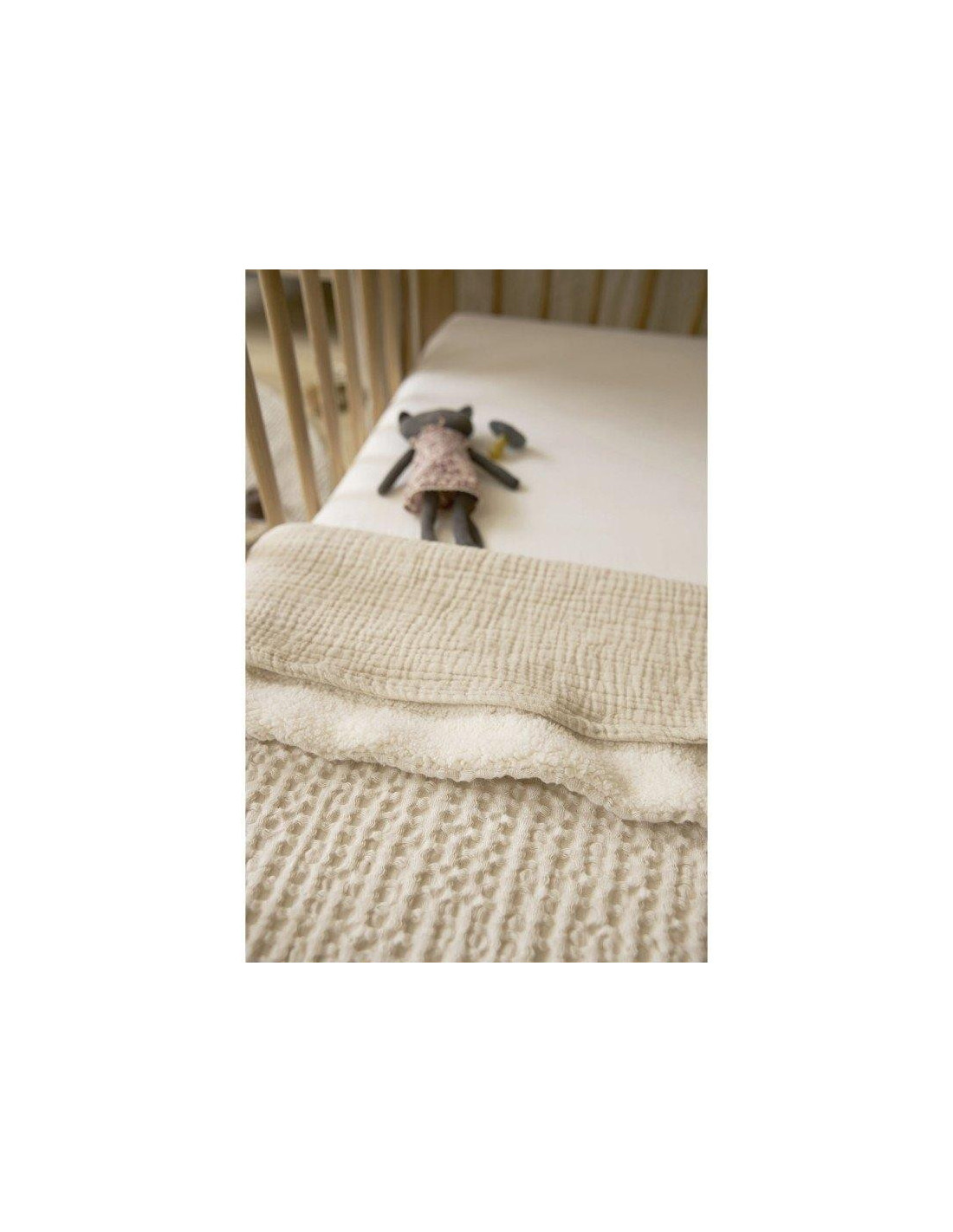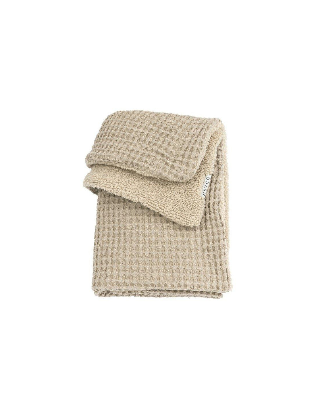 La parte delantera de la manta está confeccionada con tejido waffle de algodón 100%. El reverso es de suave tejido polar con un 100% de poliéster. La manta tiene un valor TOG de 2,0. Cuanto mayor sea el valor TOG, más cálida será.