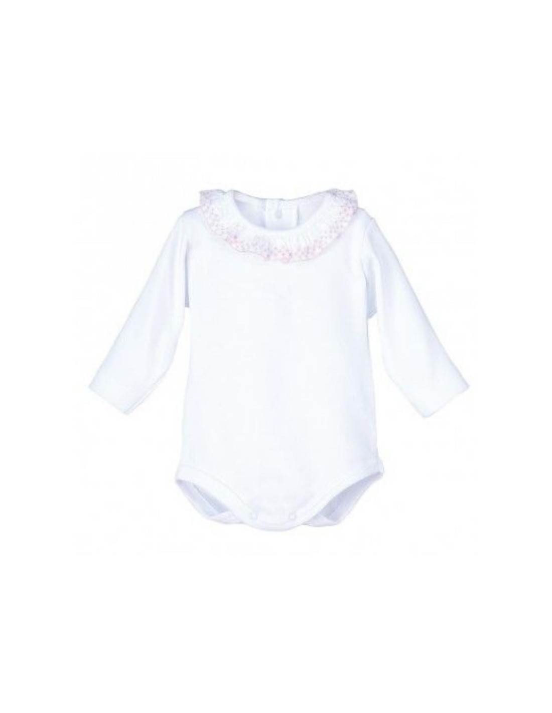 Este precioso body de manga larga es una prenda básica pero con un toque muy especial gracias a sus delicados volantes bordados en cuello y puños, que aportan elegancia y dulzura a cualquier conjunto.