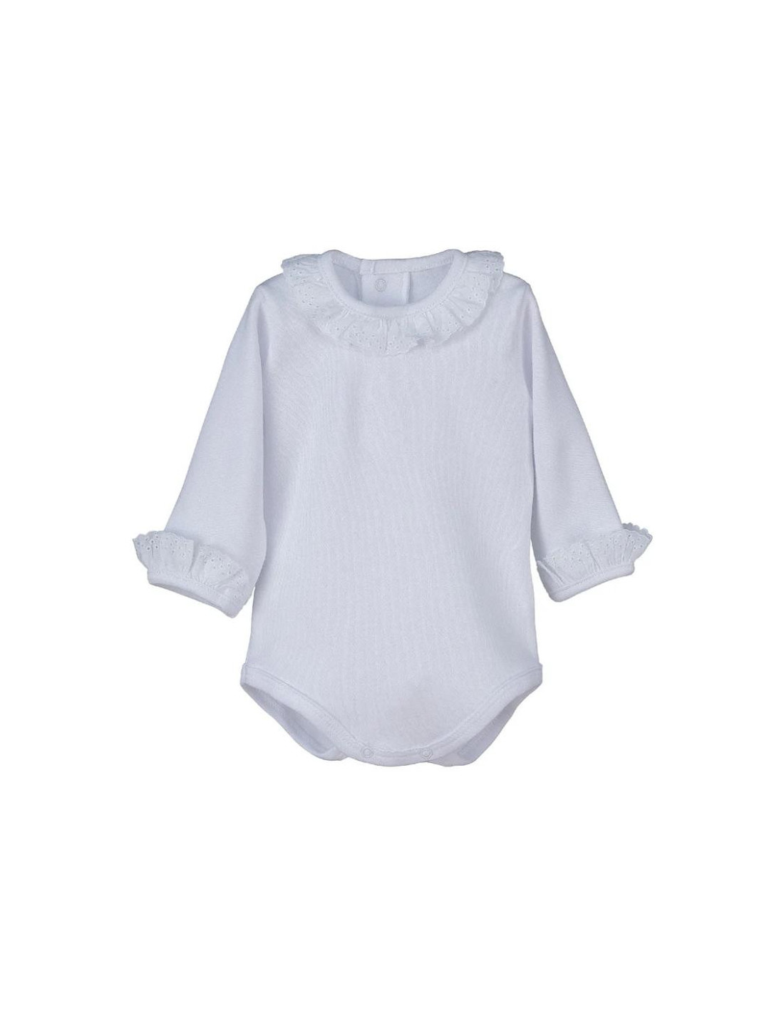 Este precioso body de manga larga es una prenda básica pero con un toque muy especial gracias a sus delicados volantes bordados en cuello y puños, que aportan elegancia y dulzura a cualquier conjunto.