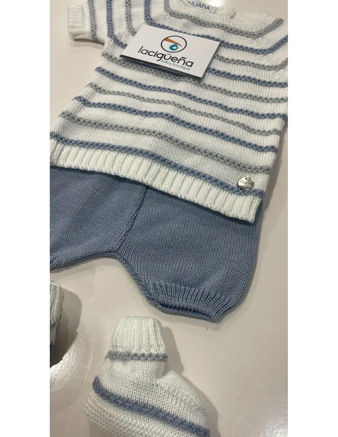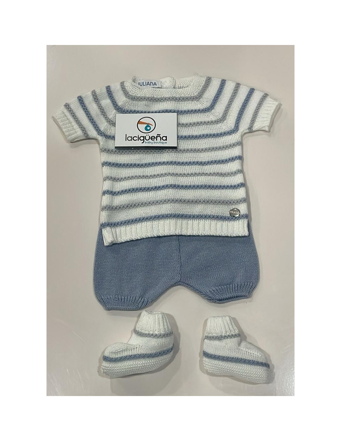 CONJUNTO 3 PIEZAS HILO MANGA CORTA CON PANTALON CORTO Y BOTITAS ONDAS BLANCO CIELO JULIANA