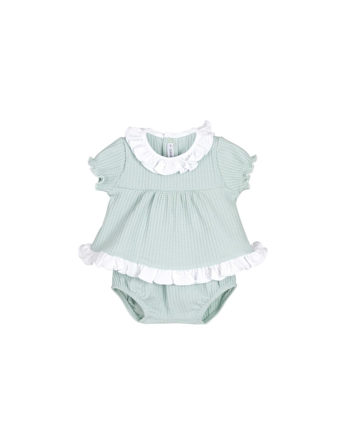 Conjunto manga corta algodón 100% con volante en cuello y en el bajo de la blusa.