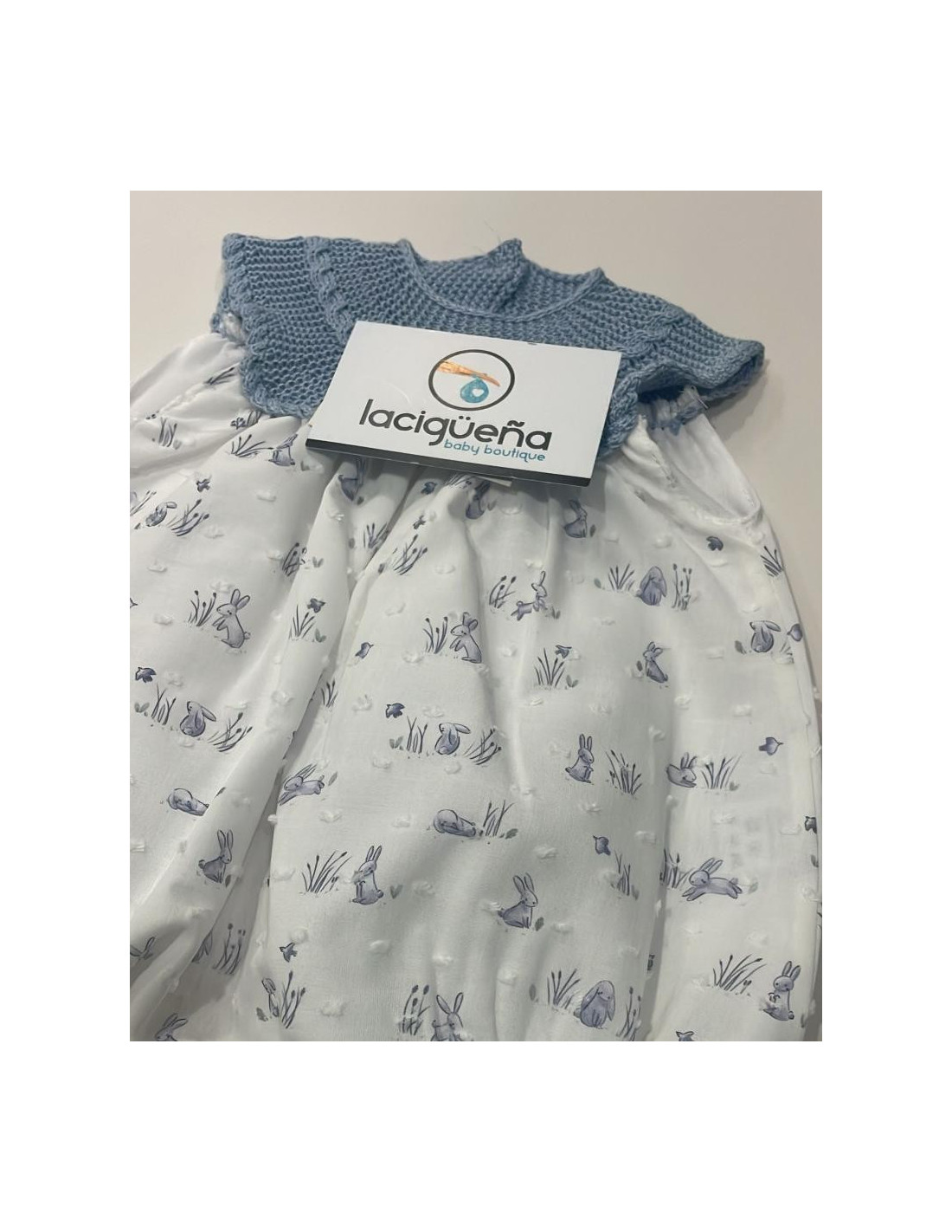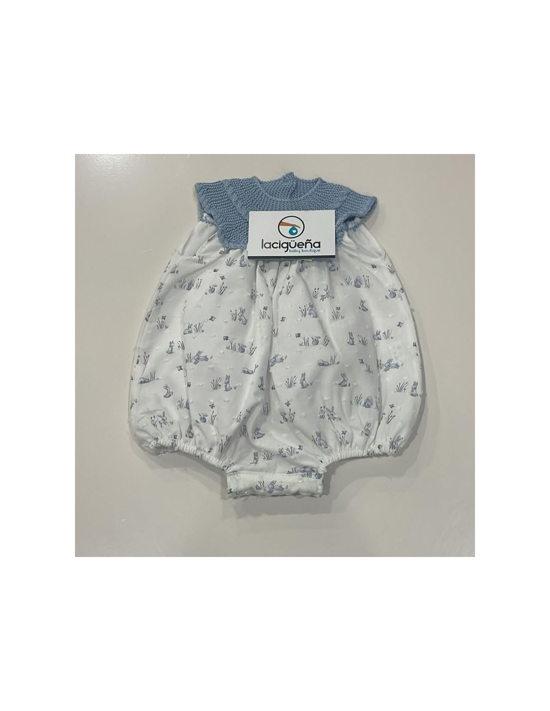 Pelele sin manga cuerpo hilo azul y estampado conejitos.