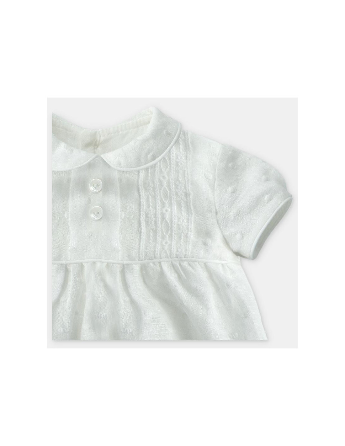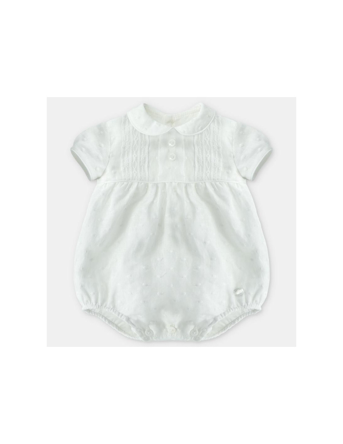 Pelele bautismal en tela bordado con bodoques todo en beig.