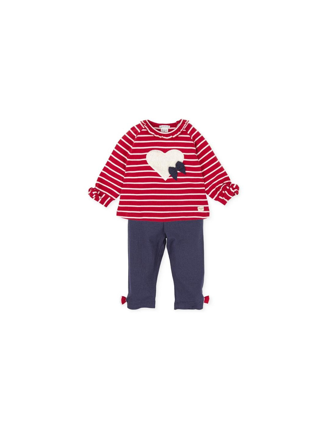 Conjunto 2 piezas. Camiseta de interlock rayas en color rojo con bordado y lazos. Pantalón en color azul marino con suave elástico en cintura .