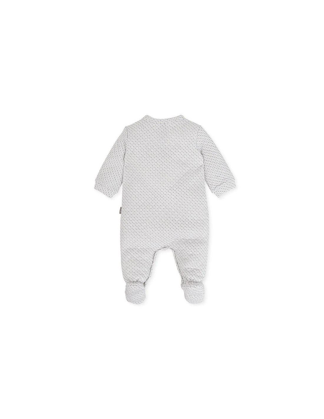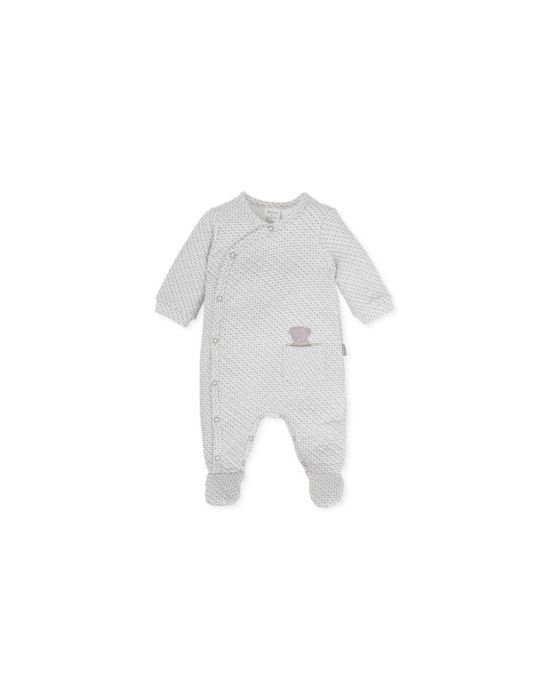 Pelele largo con pie de interlock acolchado pata de gallo color topo. Detalle bolsillo y osito bordado. Abertura delantera y entrepierna con botón a presión.