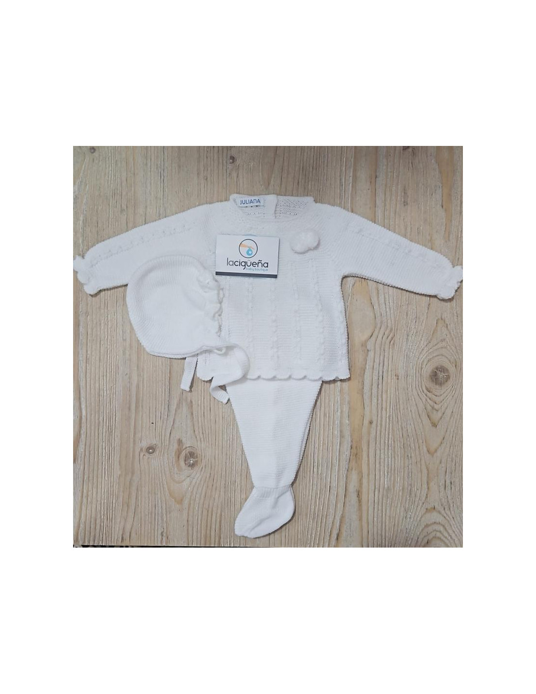 CONJUNTO LANA CON GORRO Y POLAINA POMPOM BLANCO JULIANA
