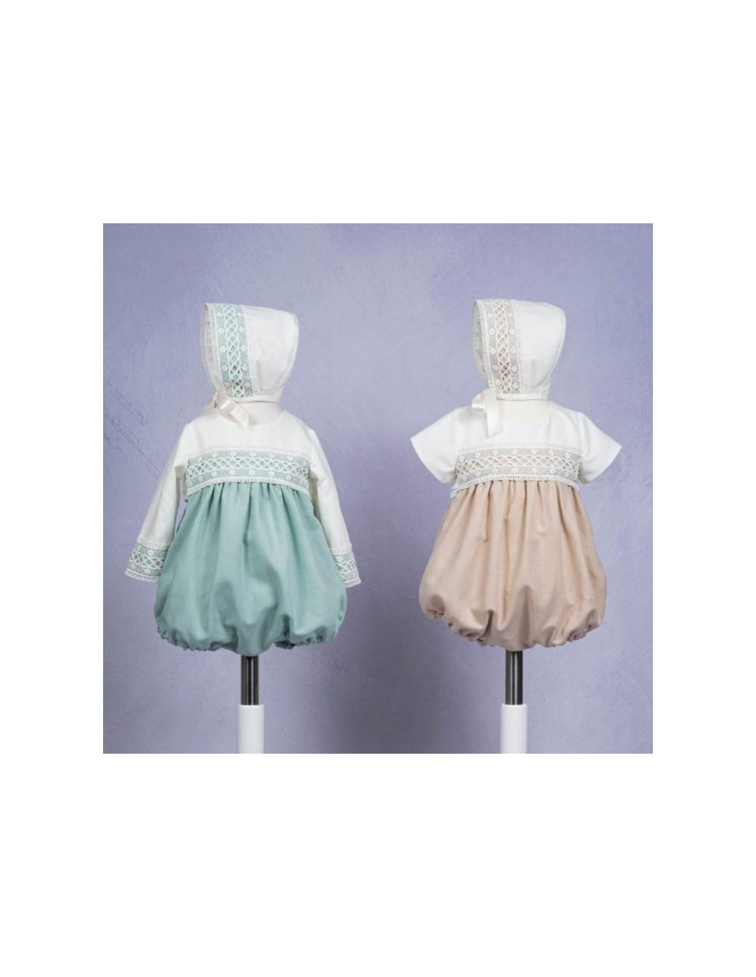 PELELE MANGA CORTA CON GORRO LINO GUIPUR VERDE BEIG MIKAMAMA