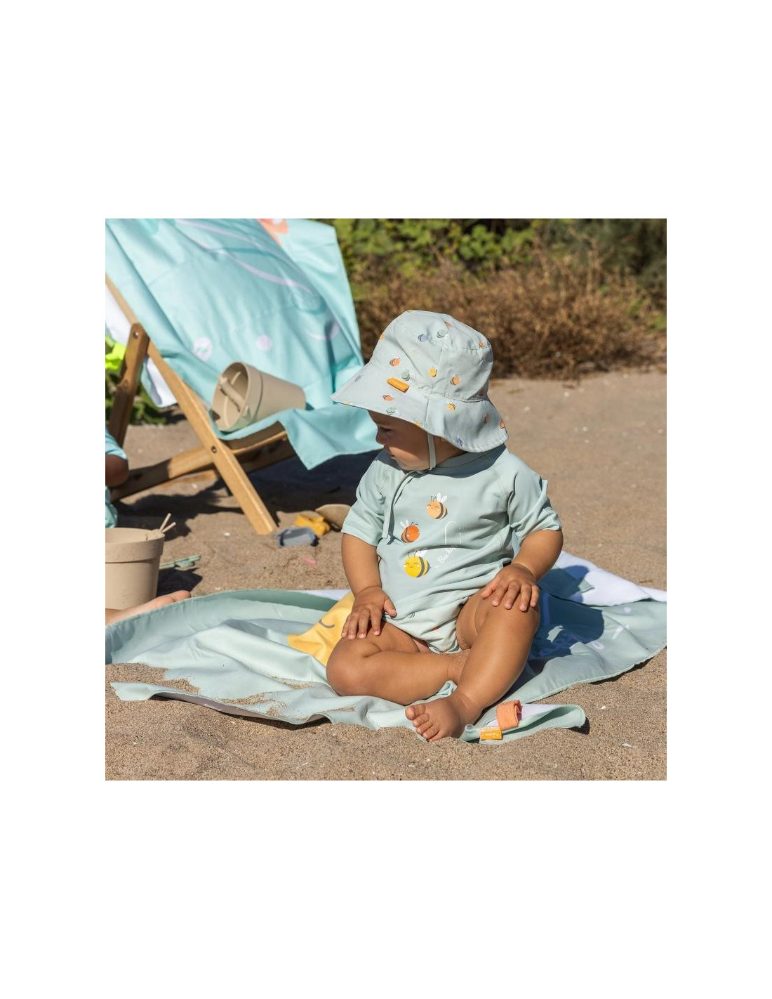 Apto para lavadora en programa delicado a 30º máximo. Enjuagar tras el contacto con agua salada o clorada. Guardar en un lugar seco alejado de la luz directa.