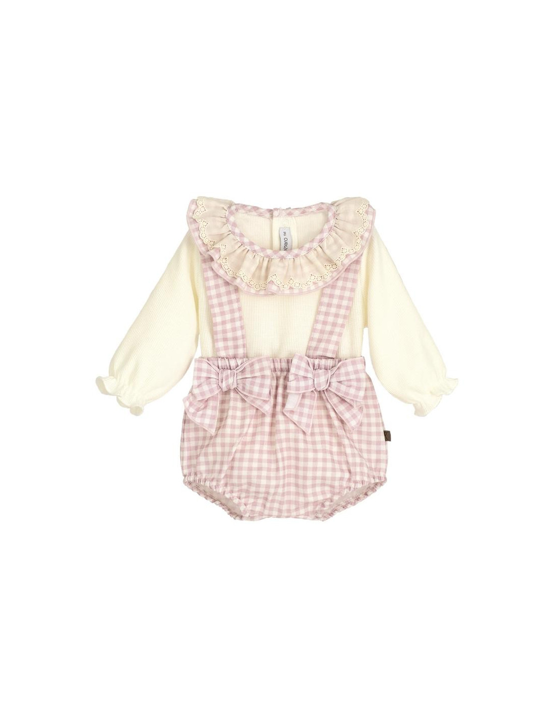 Camiseta manga larga 100% algodón con cuello bebé y ranita en cuadros vichi rosa.