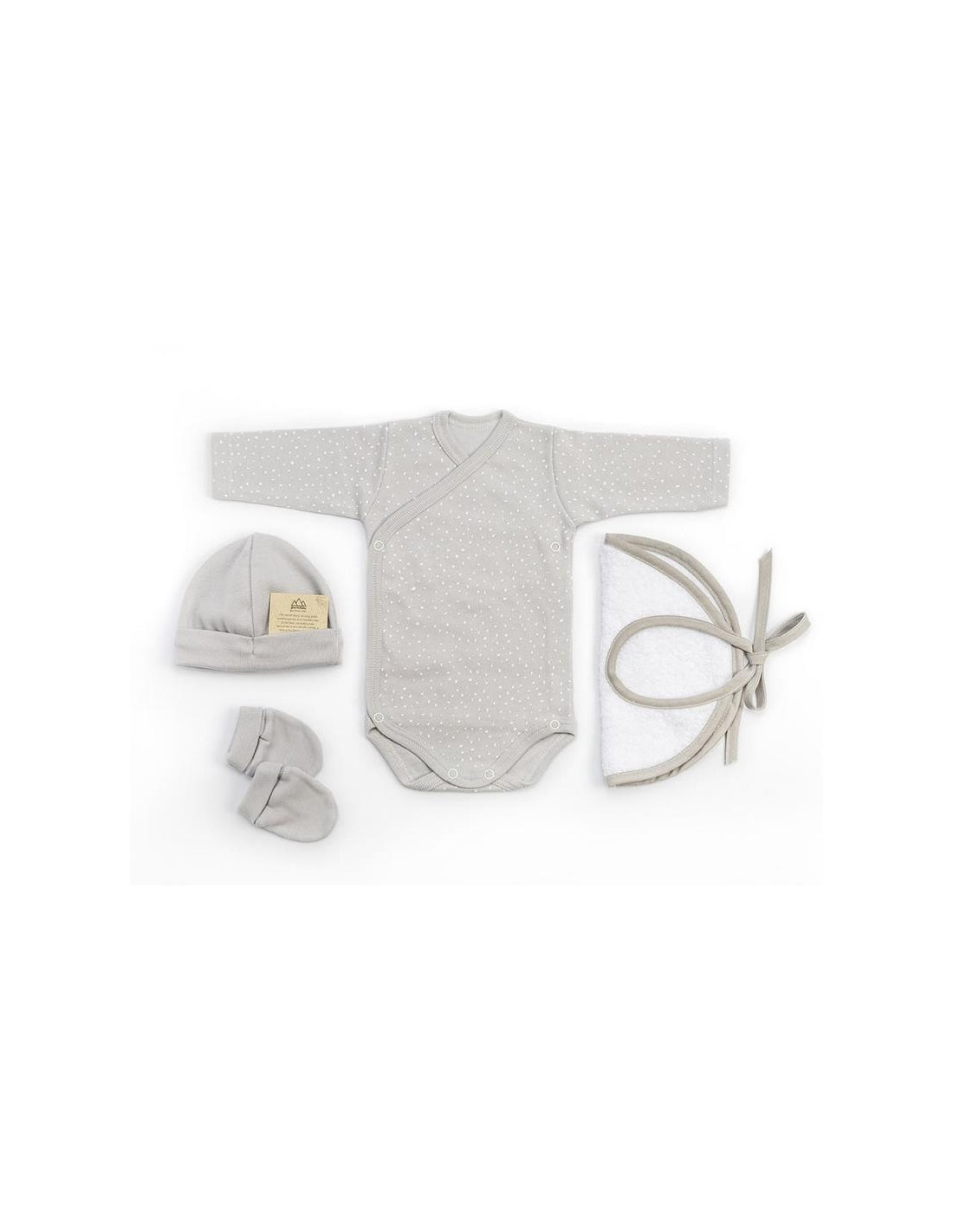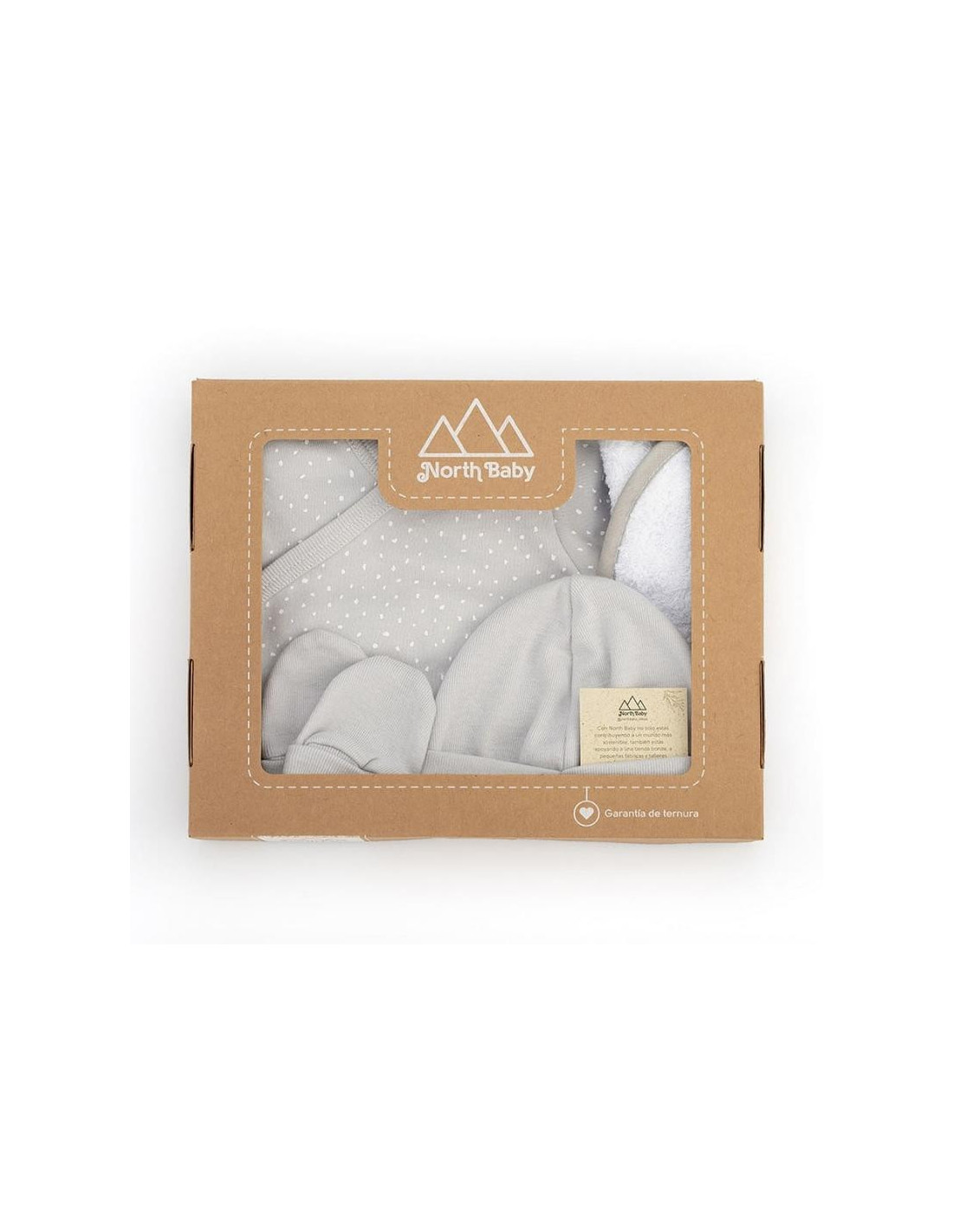 Contiene: Body de manga larga cruzado, muy cómodo para las curas del cordón umbilical. Gorrito con doble capa de algodón y sin costuras interiores con sus manoplas anti-arañazos a juego. Babero super absorbente con tiras para poder ajustarlo y que el bebé esté cómodo mientras come.